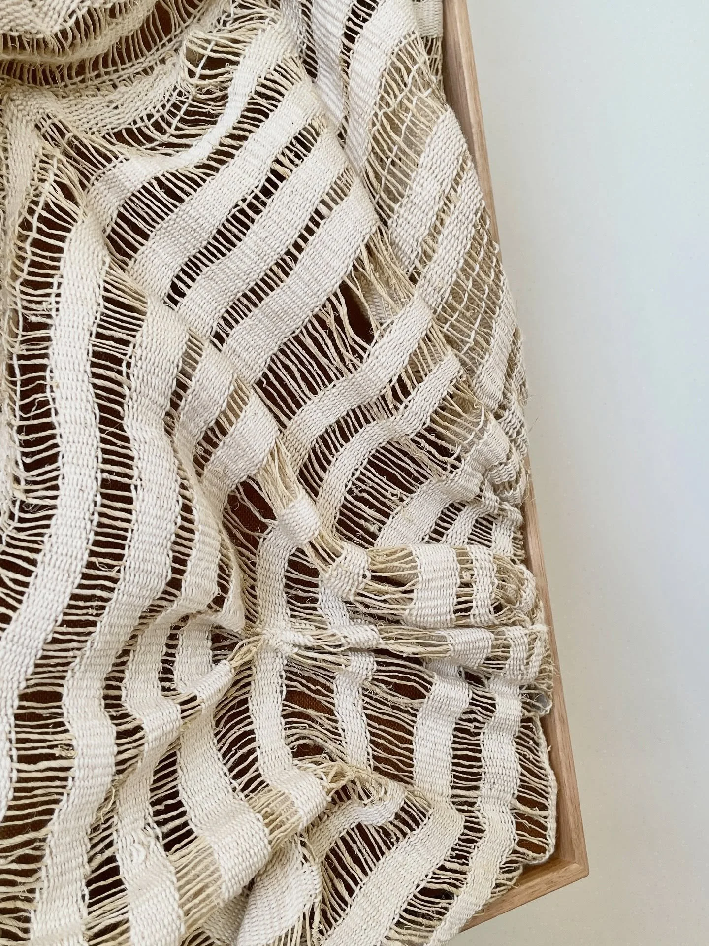 Known for their large-scale and highly textural handwoven pieces, the Hernandez sisters seek to emulate the natural forms found in Mother Nature. Their carefully curated fibre selections include Australian Merino wool, plant-based fibres, up-cycled/dead-stock fabrics, and other foraged items not typically used in traditional fibre art. Their practice has led them to develop their recognisable ‘interknot’ technique, made up of intertwining hand-knotted chains of varying texture and thickness, which graduate to a relief. The artists draw inspiration from their surrounding landscapes, familial relationships, and personal experiences woven into their abstract designs. Through extensive experimentation fuelled by curiosity, passion, and collaboration, Crossing Threads® has had the opportunity to share its art with many collectors worldwide.