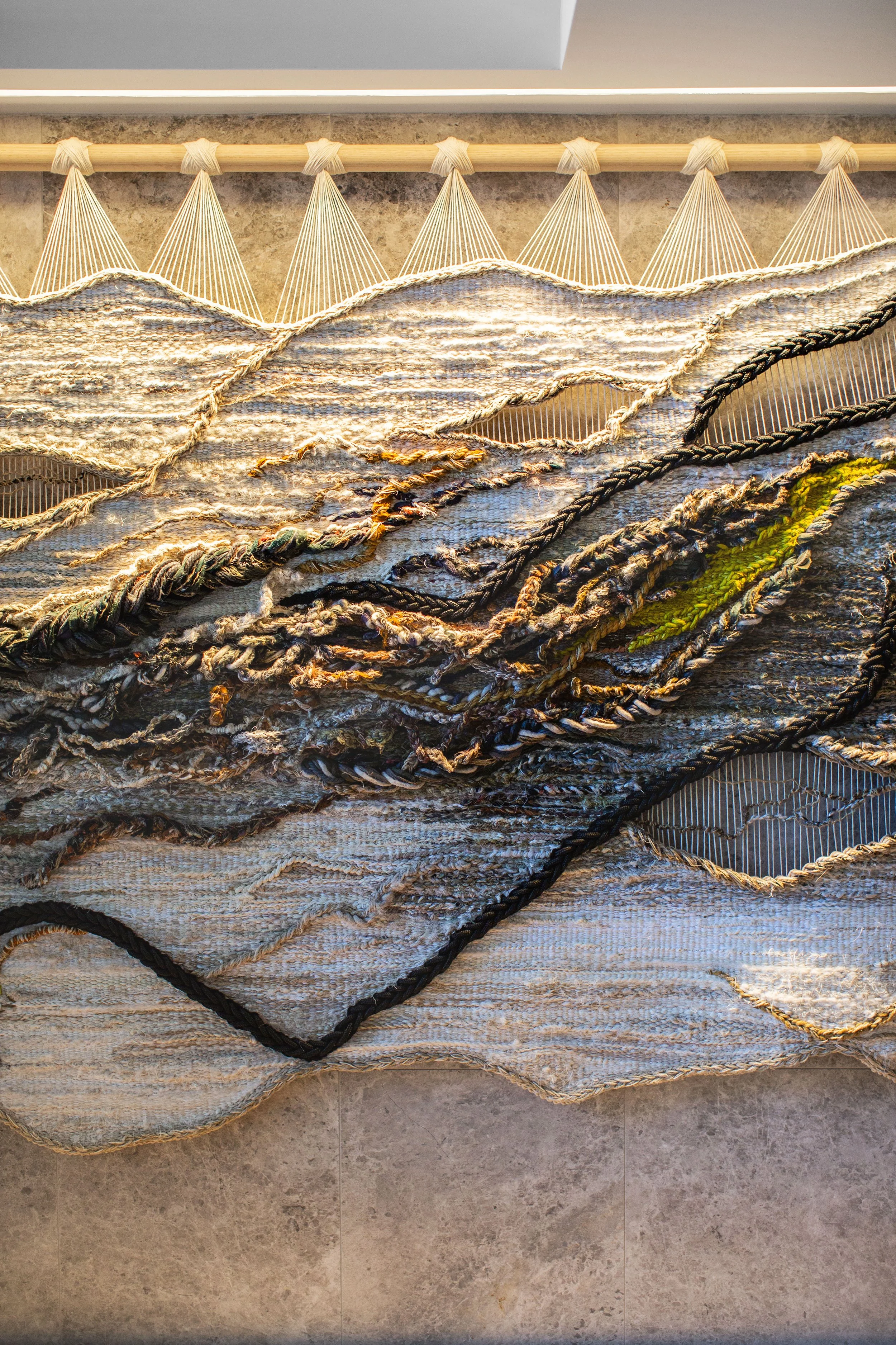 “Commissioning an artwork, particularly for a client, involves a certain leap of faith. What a fantastic experience the leap was with Lauren and Kass! From our initial contact, through to the finished piece hanging in place, the journey with Crossing Threads® has been imaginative, open and seamlessly professional. ‘TRAVERSE’ is a unique focal point in the Lobby of our project and has been well-received by our client, as well as the building’s residents and guests. A considered and beautifully executed interpretation of our brief – we are thrilled with the result! ”
