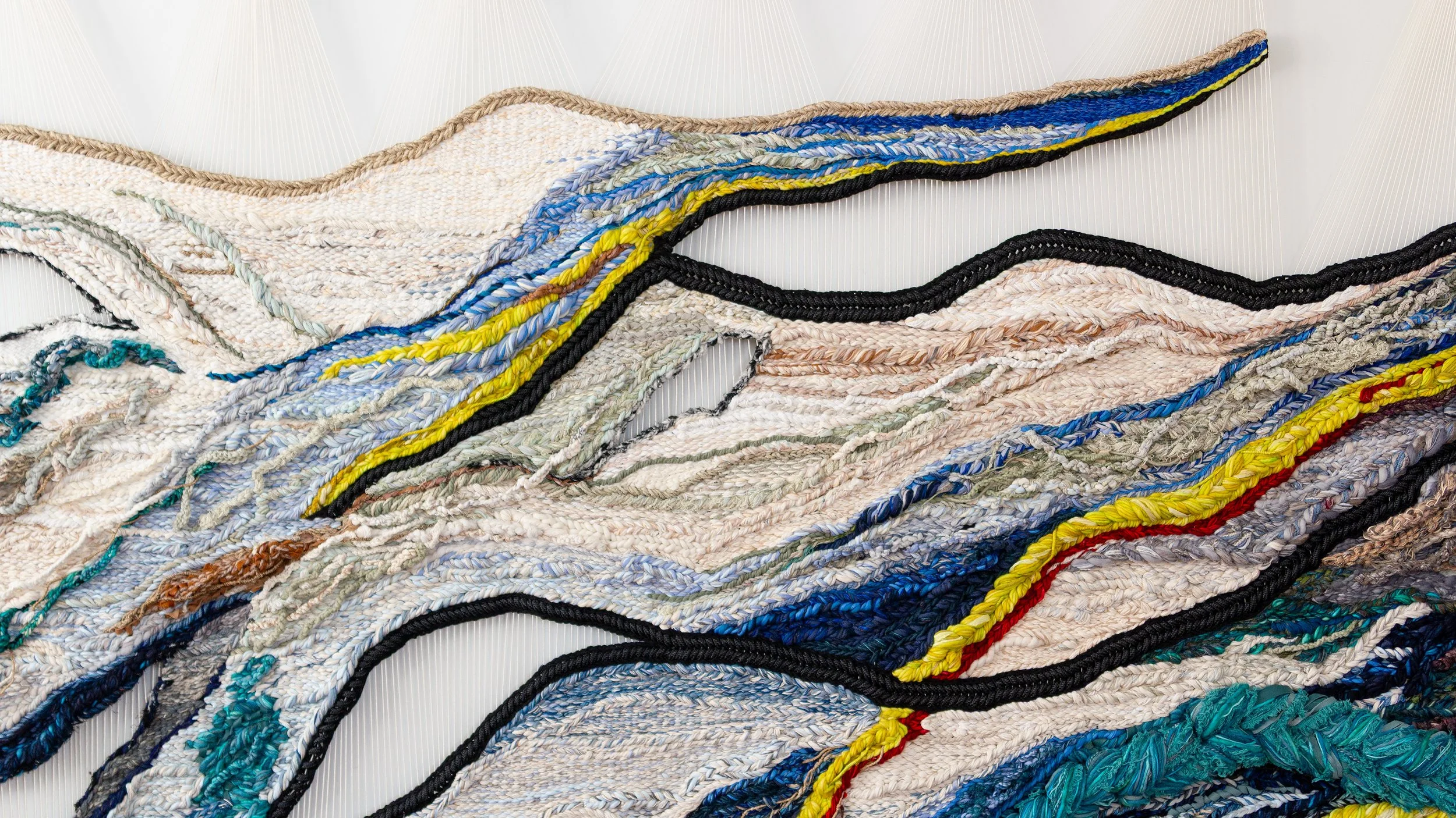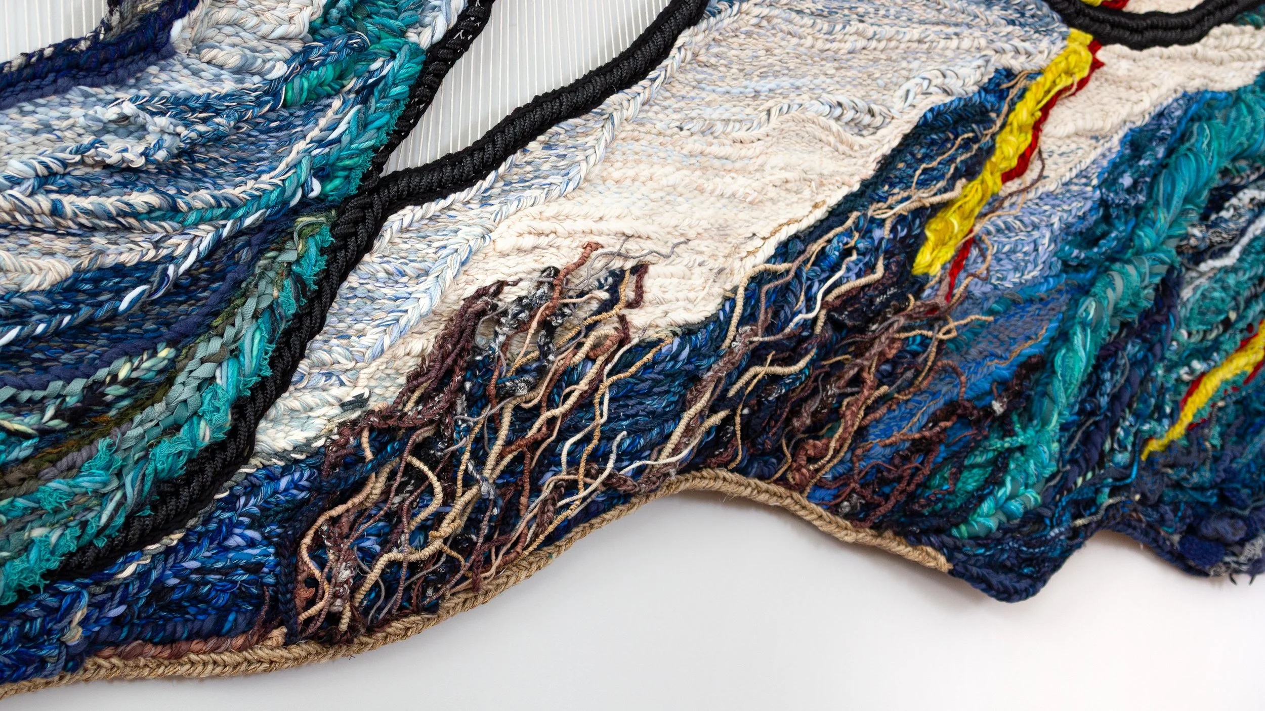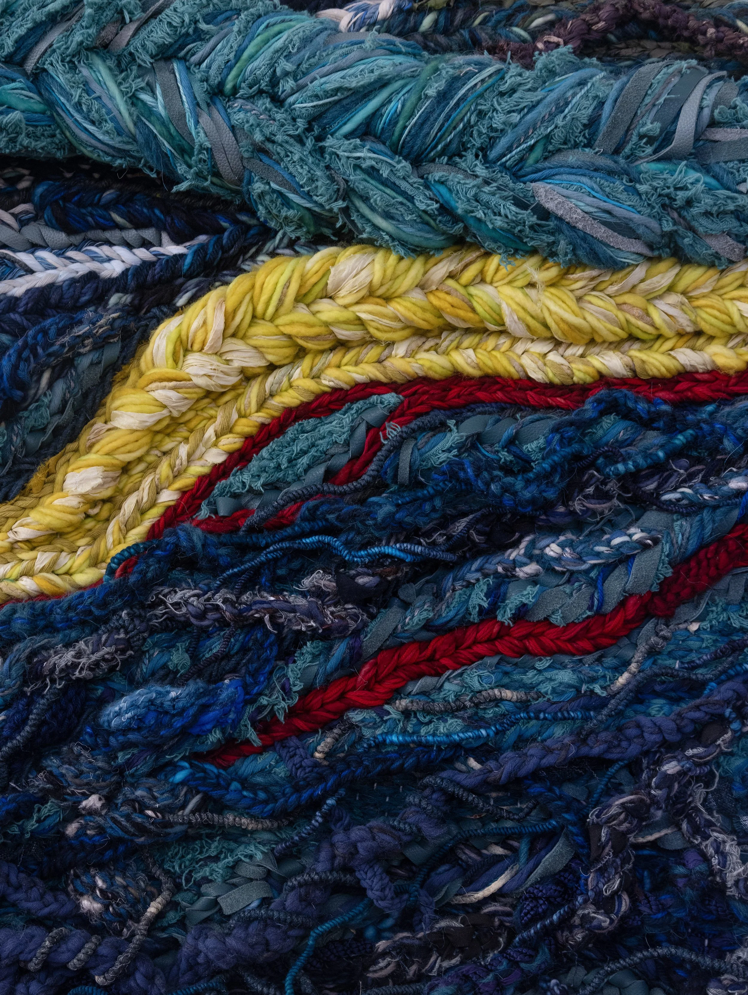 Featuring marine rope, linen, bamboo, Merino wool, cotton roping, banana silk, chenille, felted Merino wool, handspun and hand-dyed artisan Merino wool, sari silk, baby Alpaca, vintage carpet yarn, Fair Trade hemp, leather, sisal, hand-cut upcycled leather, Japanese paper & coconut husk.